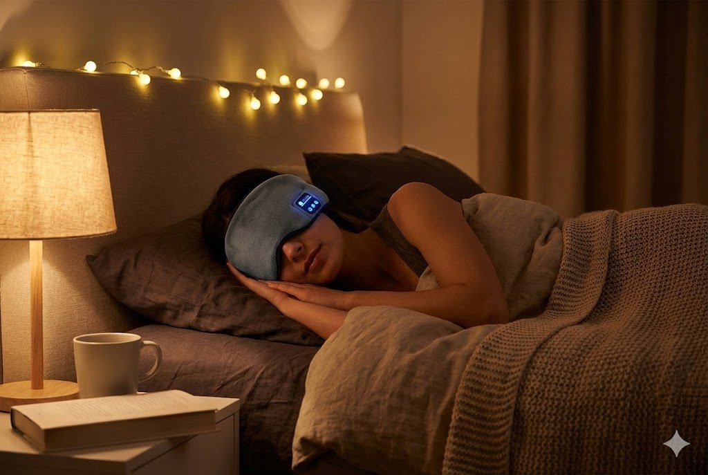 Antifaz: Conectividad Bluetooth, tejido suave acolchado, batería recargable.